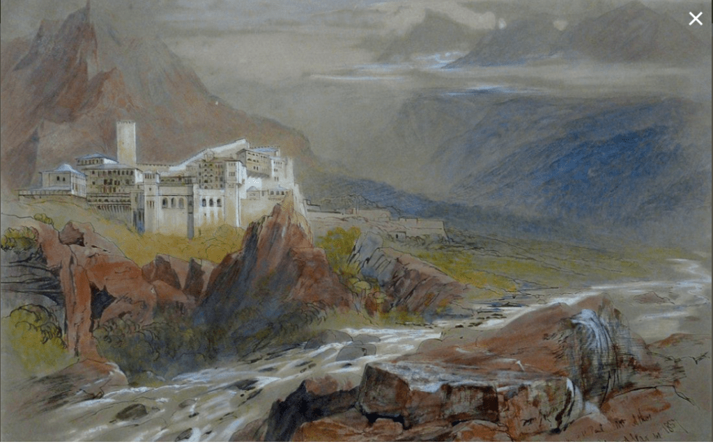 One of the most productive of Lear’s travels in terms of high quality landscape drawings was his visit to Mount Athos in Greece in September 1856. Stephen Duckworth’s new website presents all the current research on that visit. Lear’s journal has been lost but the site contains transcriptions of his extensive letters to his sister Ann, and shorter extracts from letters to four friends including William Holman Hunt with interesting variances on how he chose to describe his experiences. There are some fifty images of his drawings including ones of all the twenty main monasteries he visited. Some of these are exemplary in showing the buildings amidst dramatic landscapes. Finally of the 79 drawings he made on the journey, provenance details have been found for the vast majority, some of which can be viewed in public collections: